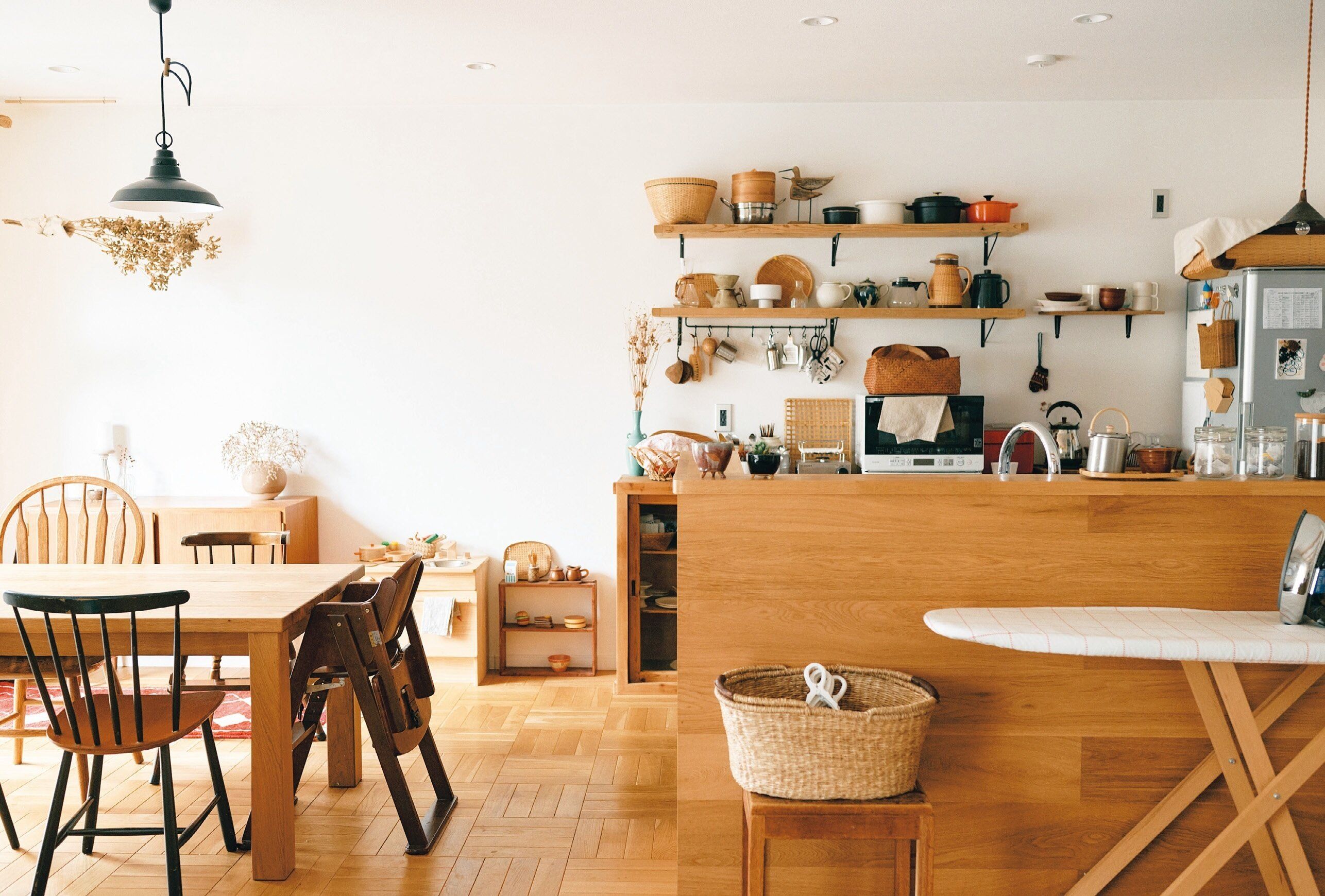 整理整頓が苦手だからこそ、自然素材のアイテムで見た目を統一。並べるだけで整って見えるし、毎日の台所仕事も楽しくできるように。