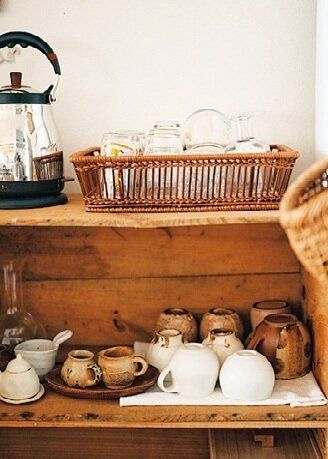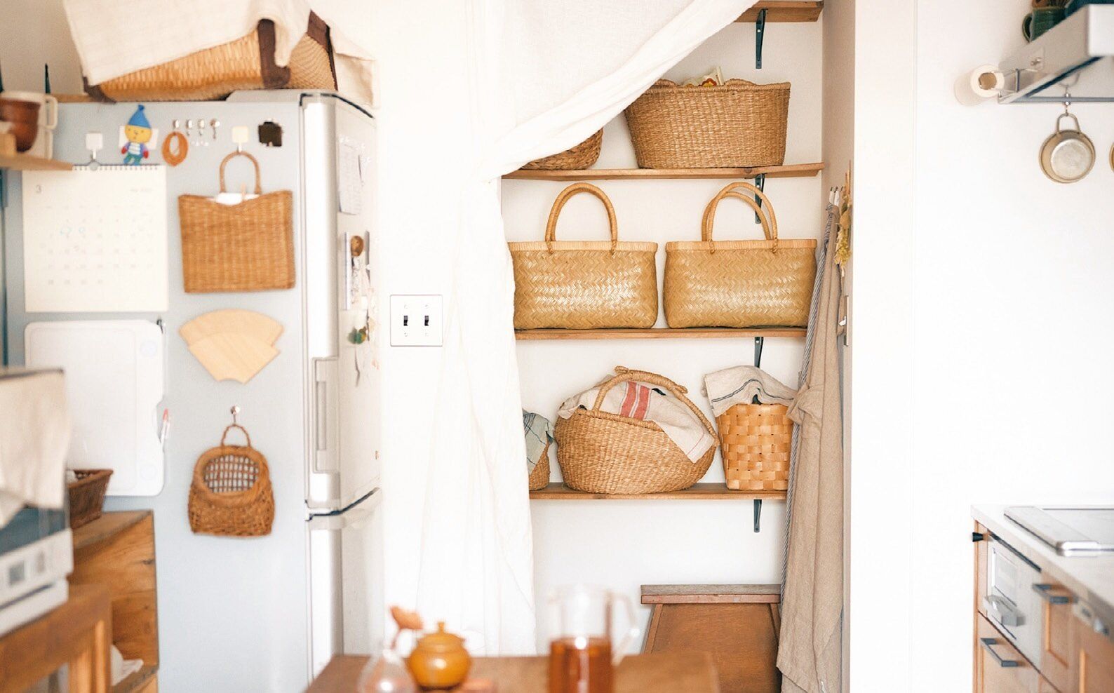 以来、古道具や自然素材を取り入れ、出しっ放しでもおしゃれに見える収納を目指すように。特にカゴ収納は雑貨感覚で気軽に取り入れられ、インテリアとしても楽しめて一石二鳥。「台所道具も素材を統一すればスッキリ見えるし、お気に入りのアイテムが、家事のモチベーションを上げてくれます」。