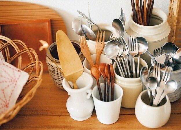 グラスやカップは素材ごとに分けて並べ、カトラリーは陶製のポットに立てて収納。形がバラバラでも色や素材がそろっていれば、何だかスッキリ。