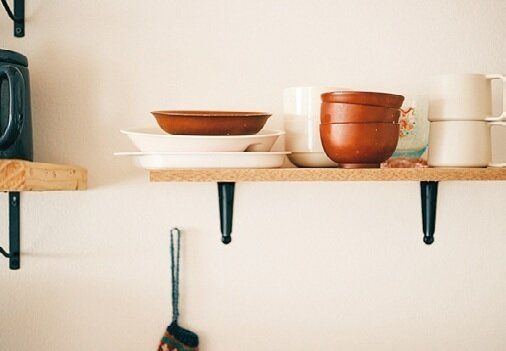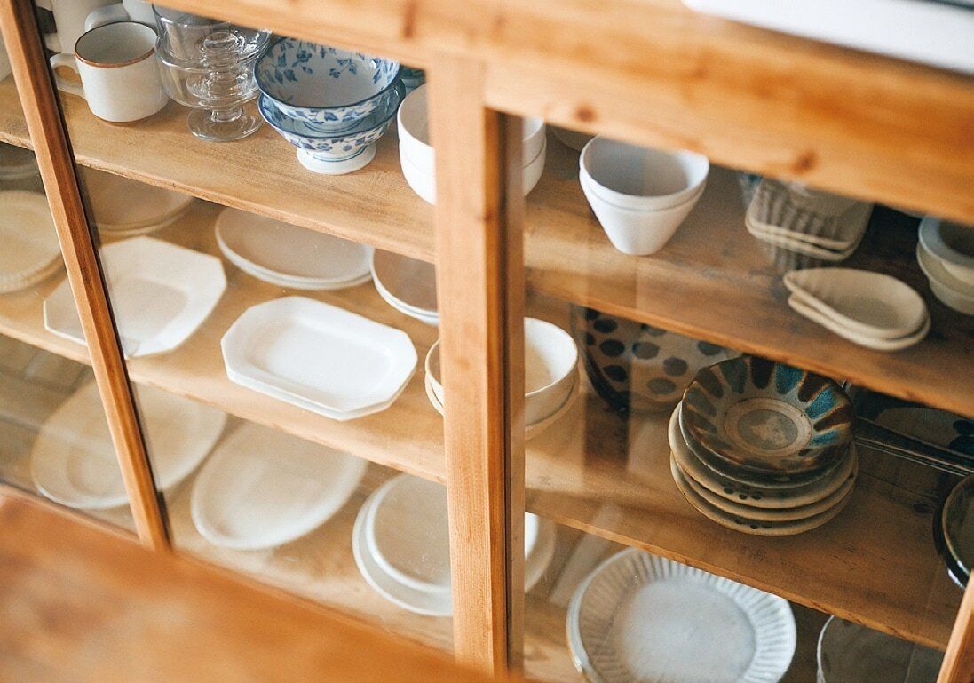 食器の収納はカフェのディスプレイを参考に。「前後で隙間が交互になるよう並べることで、棚の中が見渡しやすくなり、出し入れもしやすくなります」。