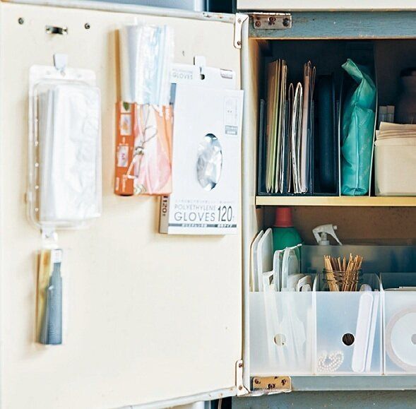扉の裏も壁の一部と考えて、袋類を入れた箱を粘着フックや粘着シートでつるす形に。扉を開けたら片手で取り出せるのでかなりラク。