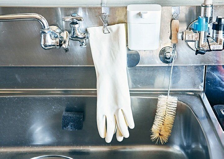 ゴム手袋、洗剤、ボトルブラシ、スポンジまで、浮かせて収納。シンクの外に水がたれないのも快適!