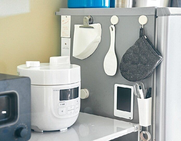 キッチンの壁や換気扇の下にフックを引っ掛けて調理道具を収納。冷蔵庫の側面や扉の裏も見逃さず、収納力をアップさせています。床に垂直な面をすべて「壁」と考えれば、必要な場所に収納をつくるのが簡単に叶います。