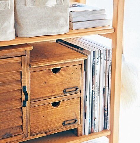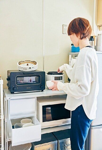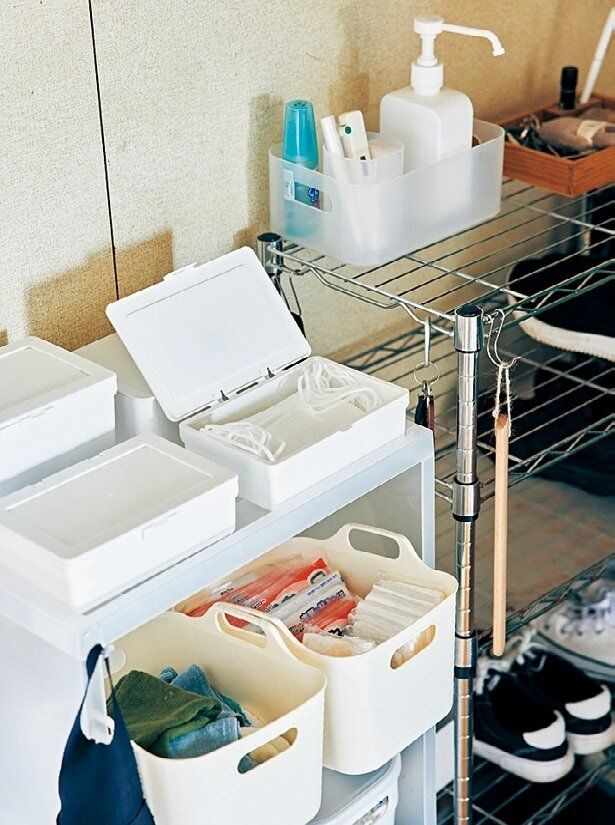 収納が少ない家ではオープン収納の家具が活躍。箱やパッケージ、物自体を白にしておけば、見える状態で収納していてもスッキリ!