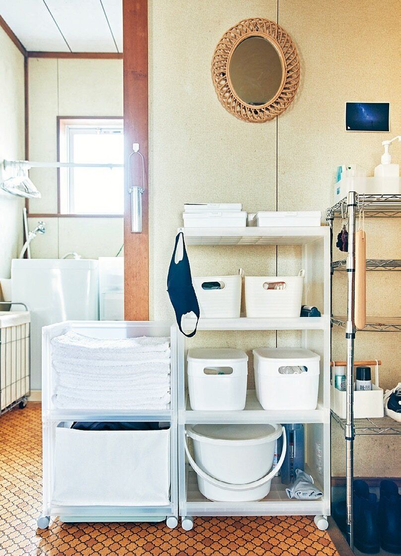 出し入れがしやすいオープン棚は便利ですが、どうしてもごちゃっと見えがち。だからケースもバケツも白を選択。タオルも真っ白に統一したおかげで、丸見えでも乱雑なイメージになりません。