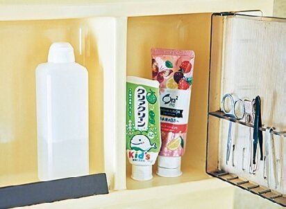 歯磨きペーストなどは、お気に入りがカラフルな物なので、扉の中を定位置に。派手な原色が見えないだけでごちゃ見え回避。