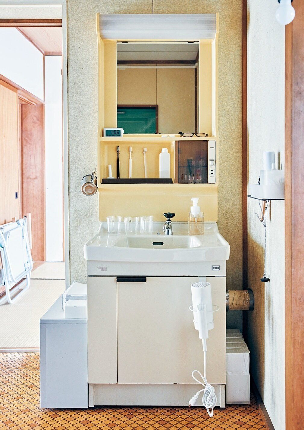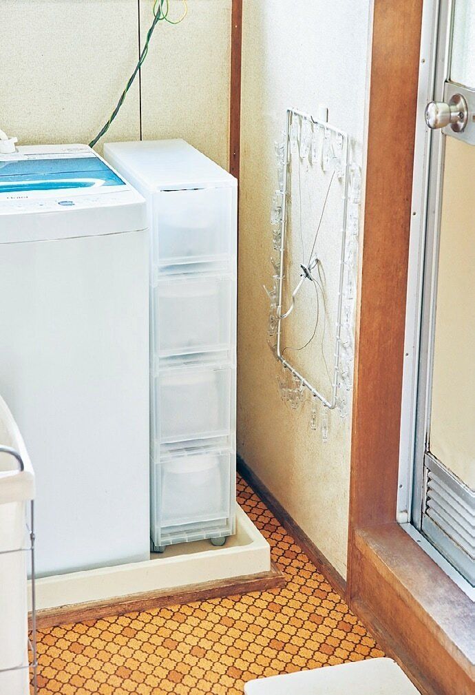 浴室扉のすぐ横に引き出しケースを配置。下着を毎回準備しておかなくても、お風呂から上がったらパッと取り出せます。玄関に近い場所だから出かける前に履く靴下もココに。
