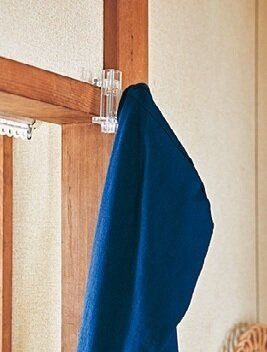 一度着たけれどまだ洗わない洋服は散らかりの原因になりやすいので、脱いだすぐそばに定位置を決めました。鴨居に取りつけられる、100均のフック1つで片づけの悩みが軽減。