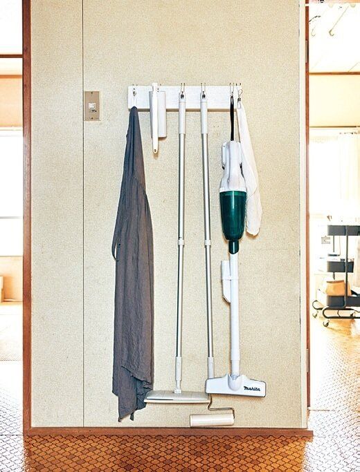 玄関の壁にも無印良品の「壁に付けられる家具長押」を活用し、掃除道具をまとめて引っ掛け収納。キッチンにも洗面シンクにも近い場所なのでパッと手が伸ばせ、使用後に戻すのもラク。使いっ放しになりません。