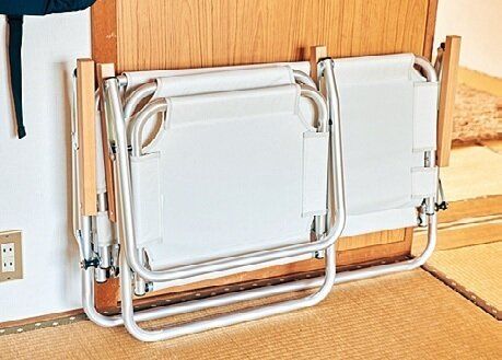 リビングも子ども部屋も各6畳なのに広々使えているのは、使わないときはたたんでおける家具を選んだから。ソファはベランダなどで使う折りたたみベンチ&チェアで代用して壁に立て掛け、学習机や椅子は押し入れ下段に収納。