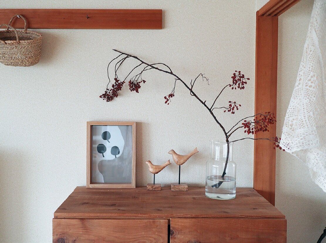 「室内に彩りは欲しいけど植物の手入れが苦手なので、水やりが少なくてすむ観葉植物や、生花より長もちする枝物を選んでいます」。大きめの枝物は1本でも絵になりやすく、物によっては1カ月以上もつ場合も。
