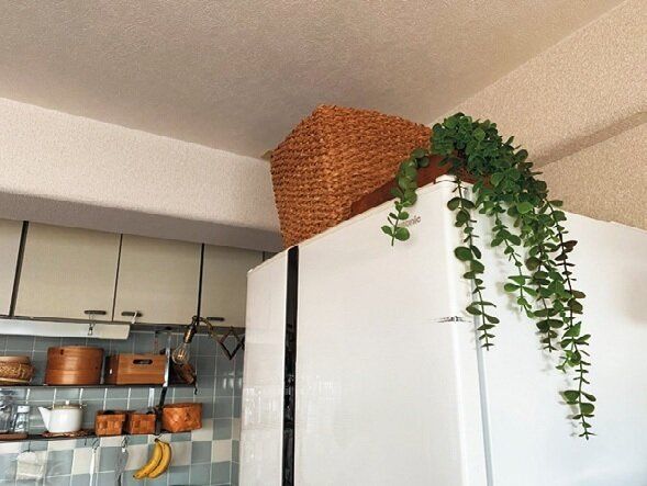 フェイクグリーンなら、日当たりは関係なく、水やりも不要!「冷蔵庫上など、高い位置から垂れ下がるタイプの植物を選ぶと、メリハリが出ておしゃれな雰囲気になります」。