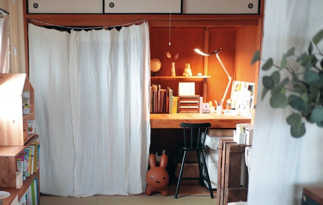 押し入れのふすまをはずし、中板を生かして長女のデスク代わりに。左側は100均のひも状レール+フックでカーテンを取りつけて、和室感をカバーしつつ、収納も出し入れしやすく。