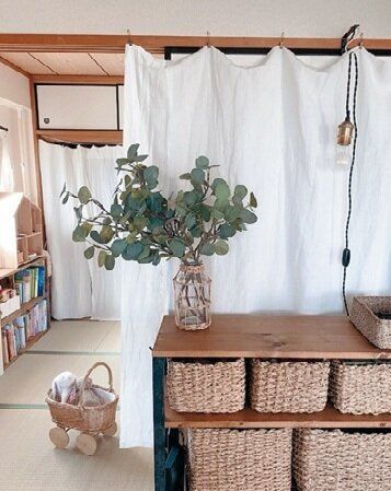 リビングの境目のふすまは、切りっ放しの布でカバー。「カーテンクリップにはさんで、なげしに引っ掛けただけ。さらにセリアの棚受けを取りつけ、電球をつるしています」。