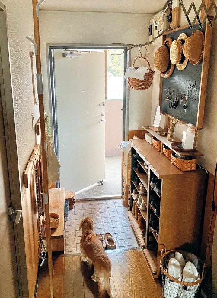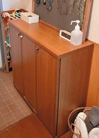 造り付けの靴箱の扉を思い切って取りはずして、出し入れをスムーズに。「中はプラスチックの棚板だったのですが、手前のほうだけ、杉板をのせたら統一感が出ました」。
