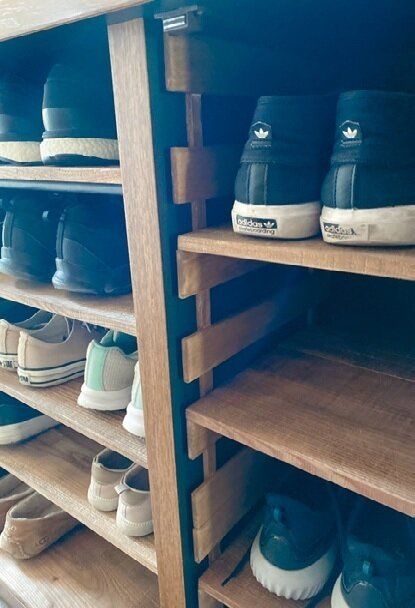 靴箱の右側は棚がなく、使いづらい空間でした。「内側に100均すのこを2枚つなげた物を両面テープで留め、すき間にカットした杉板をはさめば、収納量がアップ!」。