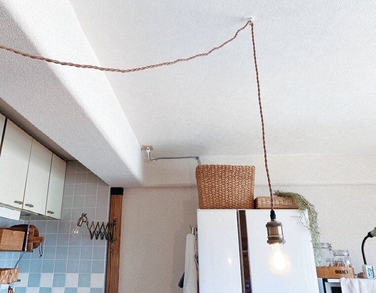 「キッチンの天井に跡を残さないようにと考えたのが石こうボード用の押しピン※。そこにワイヤーを通して、電球照明のコードをぶら下げました。温かみのある光がプラスできて満足!」。