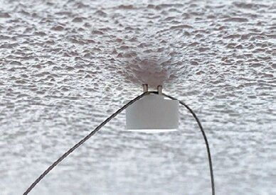 石こうボード用の押しピンを取りつけ、ピンの間にワイヤーを通す。