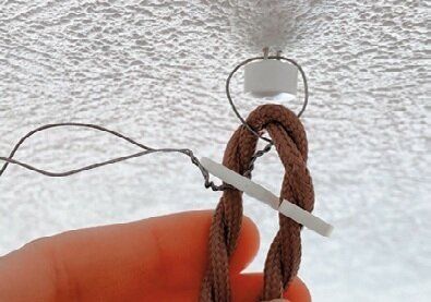 ワイヤーに照明のコードを通して、ワイヤーをねじって固定する。