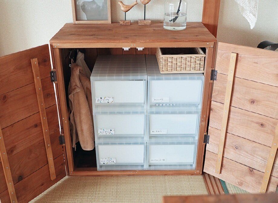 部屋全体を自然素材で統一することでぬくもりある空間に。「子ども服を収納したプラケースは、手作りのキャビネットで隠しています。杉板を細い棒で固定して箱形にした物に扉をつけただけなので簡単です」。
