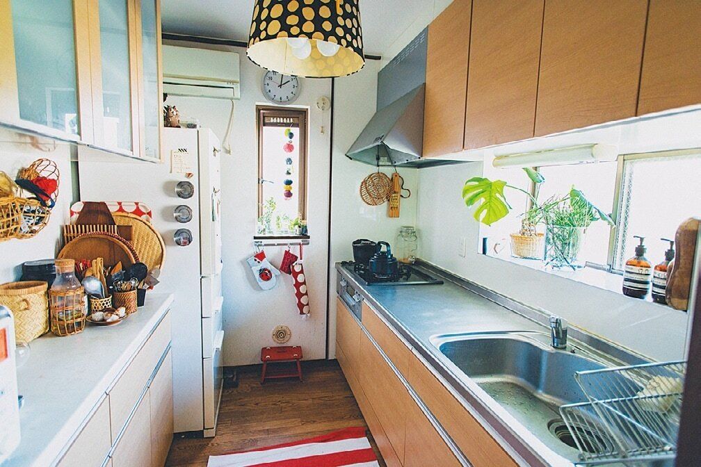 古道具が好きなので、家具はヤフオクなどで入手。色みがそろって統一感が生まれました。インテリアの差し色以外の物は、カゴに入れたり布を掛けたりしてスッキリと。