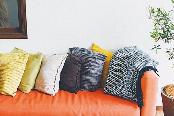 秋冬はクッションカバーを落ち着いた色みに変えて、お昼寝用のガーゼケットもウールのブランケットに交換。見た目でも肌ざわりでも季節感を楽しみます。