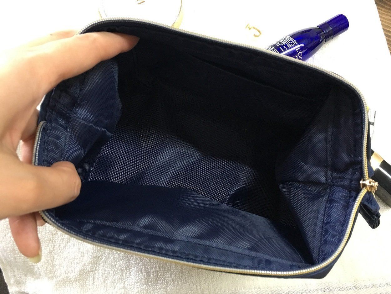 ポーチの中には内ポケットが1ヵ所あるので、細かいものはここに入れておけば、散らばることもありません。高さが11cmもあるので、リップやミニサイズのハンドクリームなどが立てて入れられるのも、うれしいポイント。