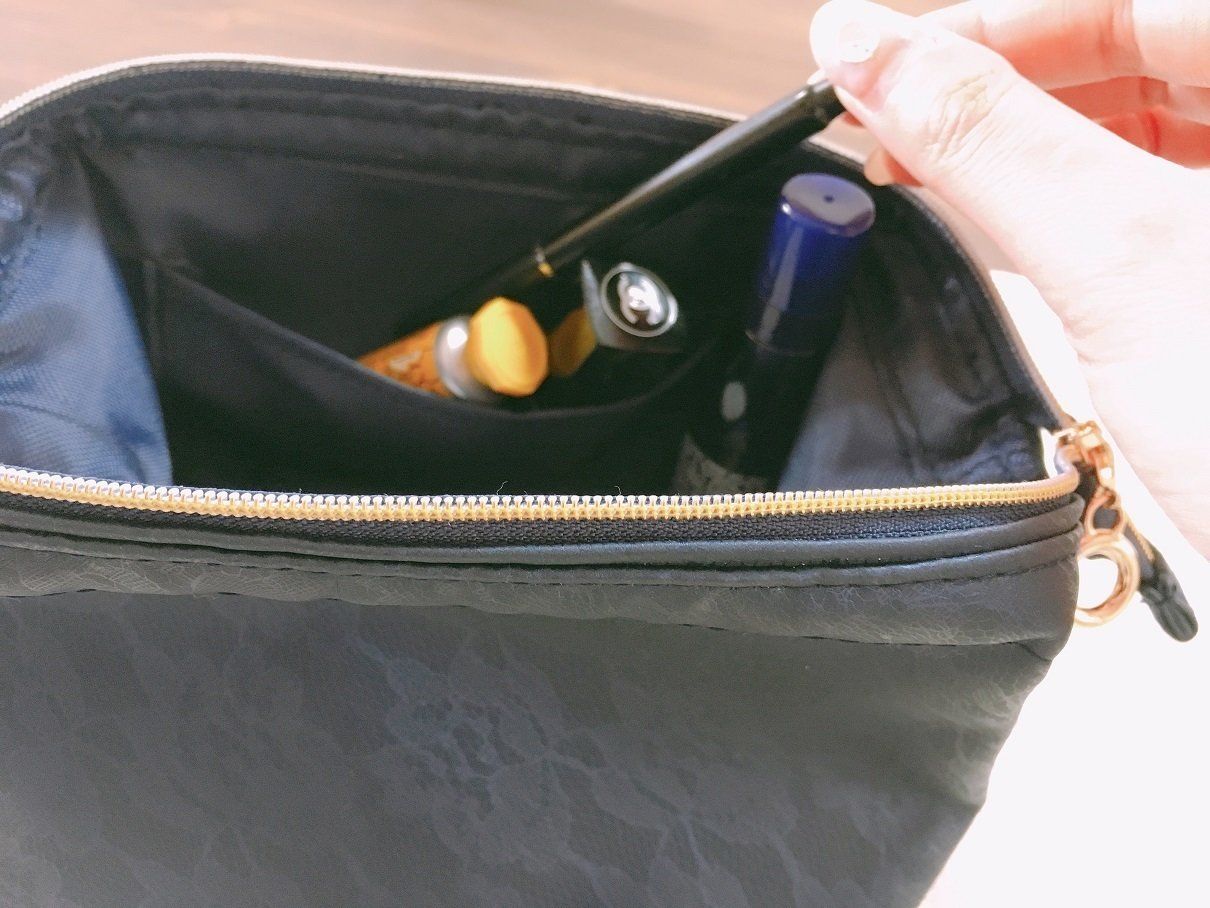 そのほか、ファンデーションからリップペンシルまで日常的に使うベーシックなコスメが入ります。ゴールドのチャームがついたファスナーも、開閉しやすくてかわいいですね。