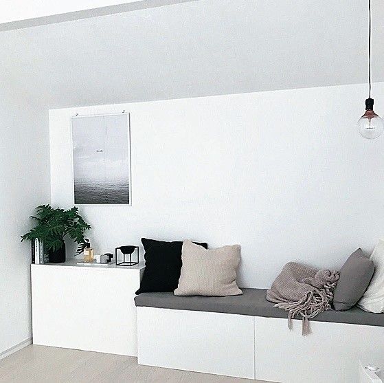 寝室は白とグレーをベースにし、「ソストレーネグレーネ」の黒い花びんなどをポイントに。ベンチソファは、「イケア」の木製棚に白のマステを貼って自作。
