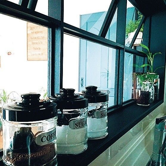 オープンだったキッチンカウンターには、自作の窓をはめ込み、既存の木目の窓枠に黒のマステを貼ってシックな雰囲気に。