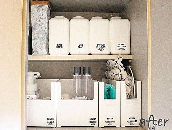 上段は洗剤のストック、下段はよく使う重曹やクエン酸を収納。ラベルは、市販のものや自作したりも。白い容器にまとめたり詰め替えるだけで、見た目がスッキリします。