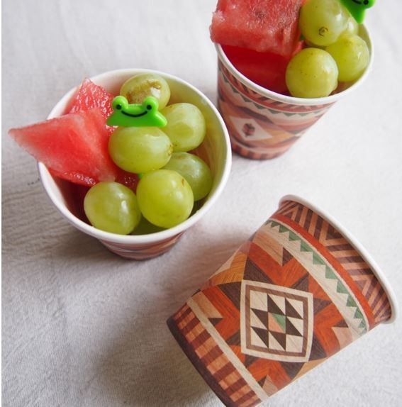 デザート用に家からタッパに入れて持ってきたフルーツをネイティブ柄のペーパーカップに入れるだけで、食べやすいですし、定番のフルーツもちょこっとよそいき仕様になります♪このように飲み物だけではなく、フルーツやパスタ、サラダ、ちらし寿司なんかをペーパーカップに入れてもいいですよ。