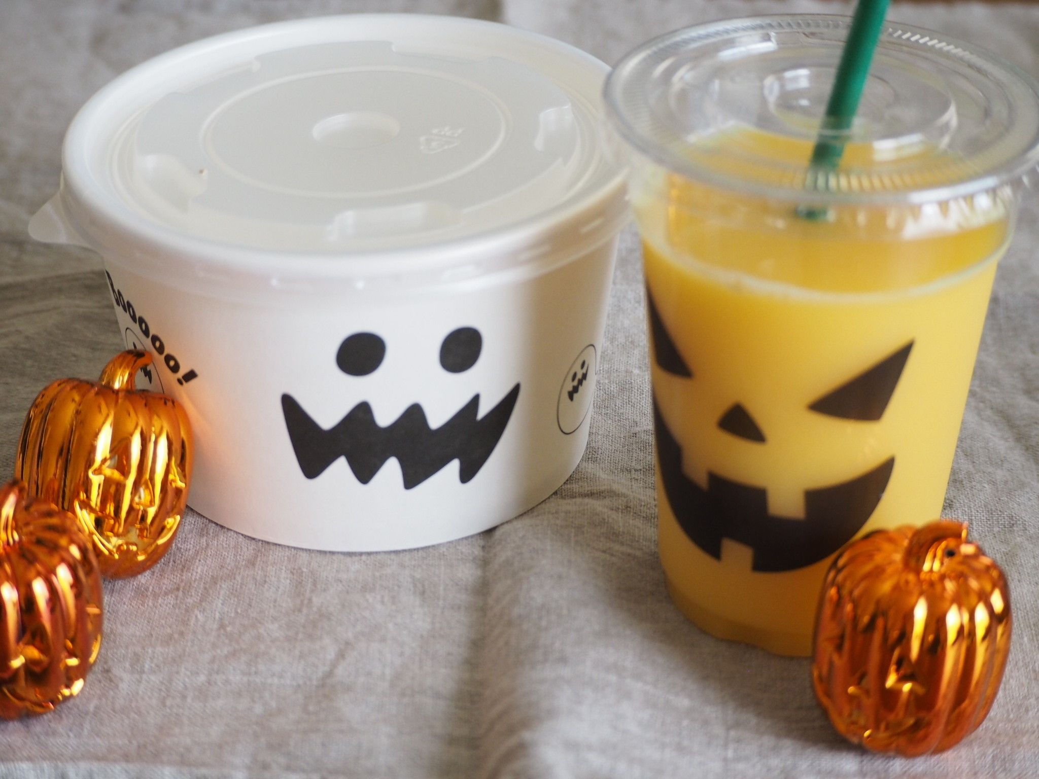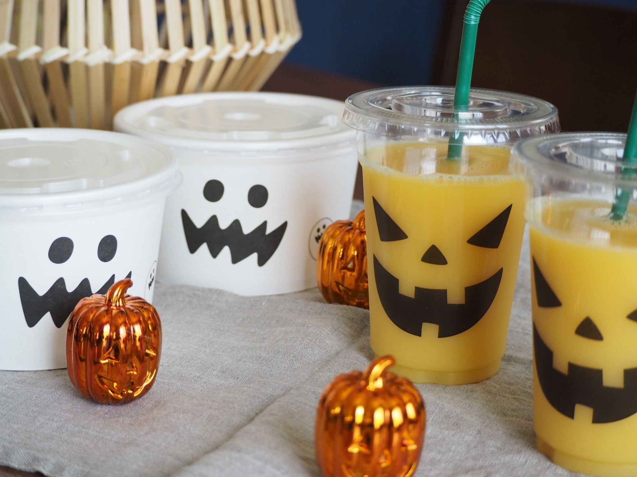 セリアの「フタ付きクリアカップ ハロウィンパーティー」と「フタ付きポップコーンカップ」はジャックオーランタンとお化けのモチーフで置いておくだけでハロウィン気分!