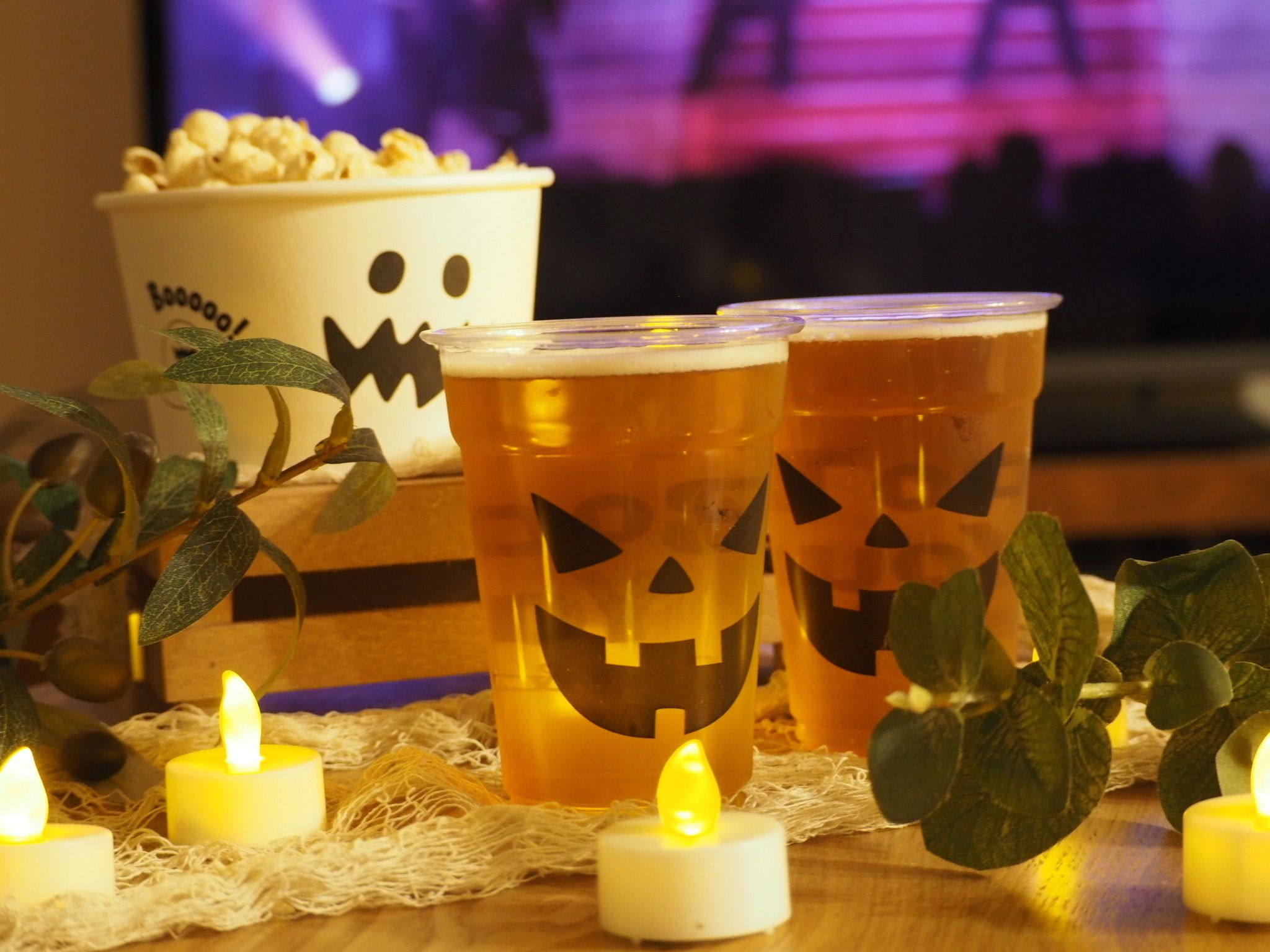お休みの前の日の夜こそハロウィンを楽しんで!好きなDVDとともにハロウィンモチーフのカップで乾杯!100均にも売っているLED キャンドルライトを灯せば夜もお家ハロウィンを楽しめちゃいます!