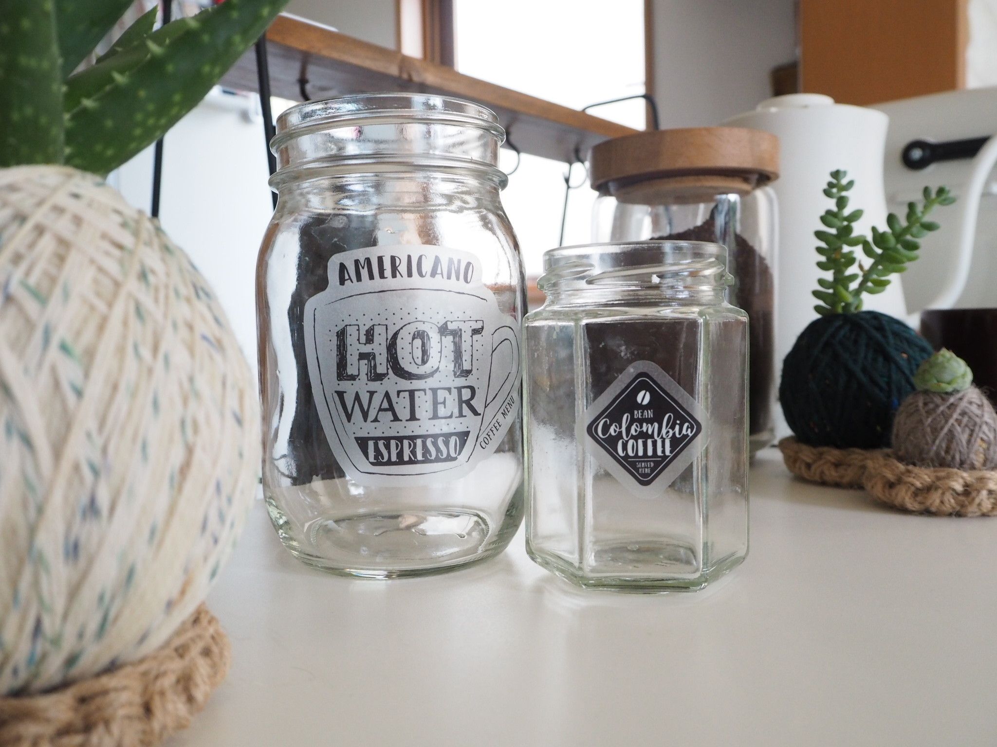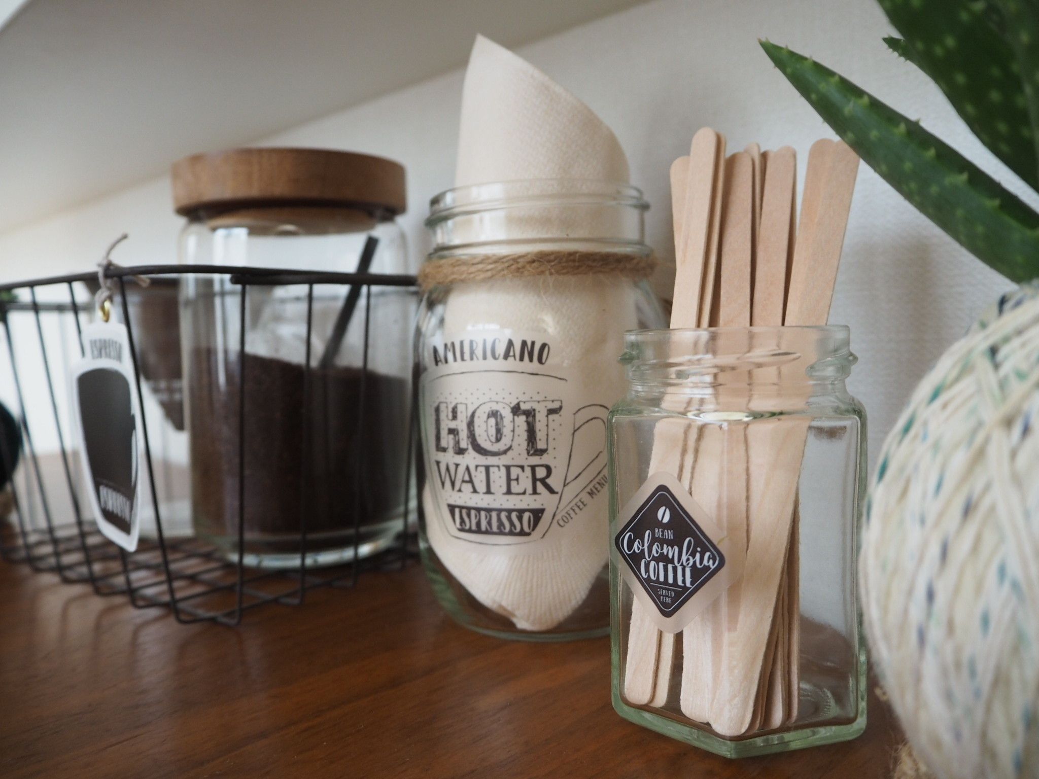 ジャムの空き瓶などにステッカーを貼れば雰囲気の統一された入れ物の出来上がり!この中にナプキンやシロップ、マドラーを入れておけばよりカフェ感を楽しめちゃいます!
