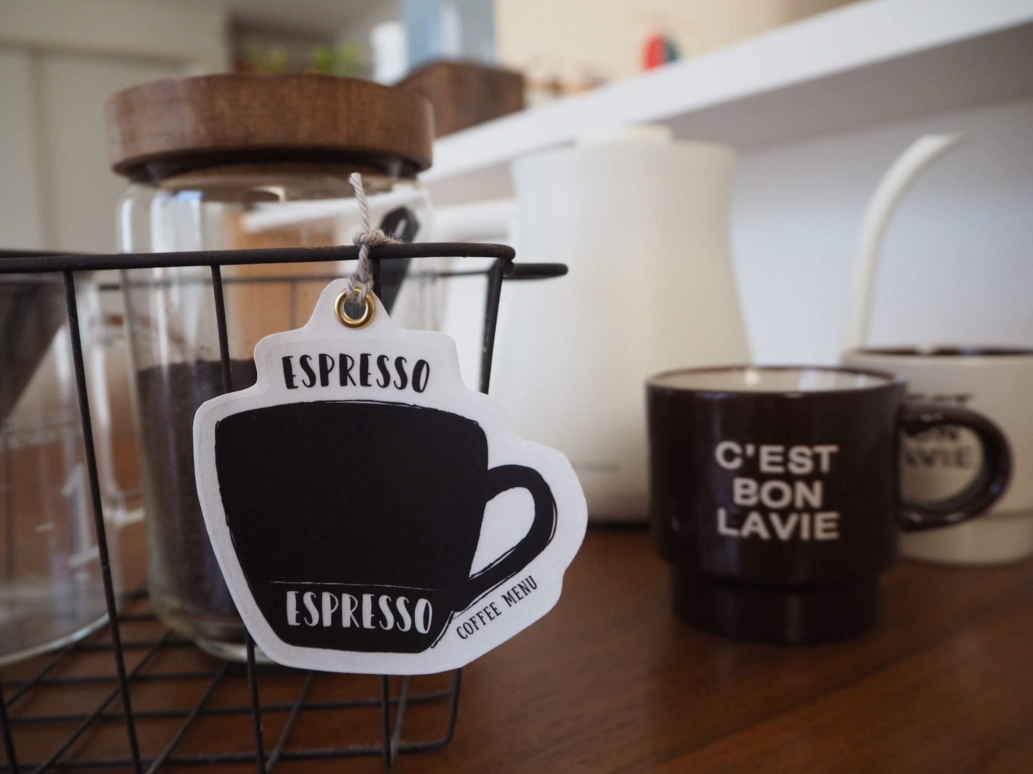 ステッカーを画用紙に貼ってハサミで切るだけ!パンチで穴を開ければタグも簡単に作れるのでコーヒーセットが入ったカゴにぶら下げておくのも可愛い!