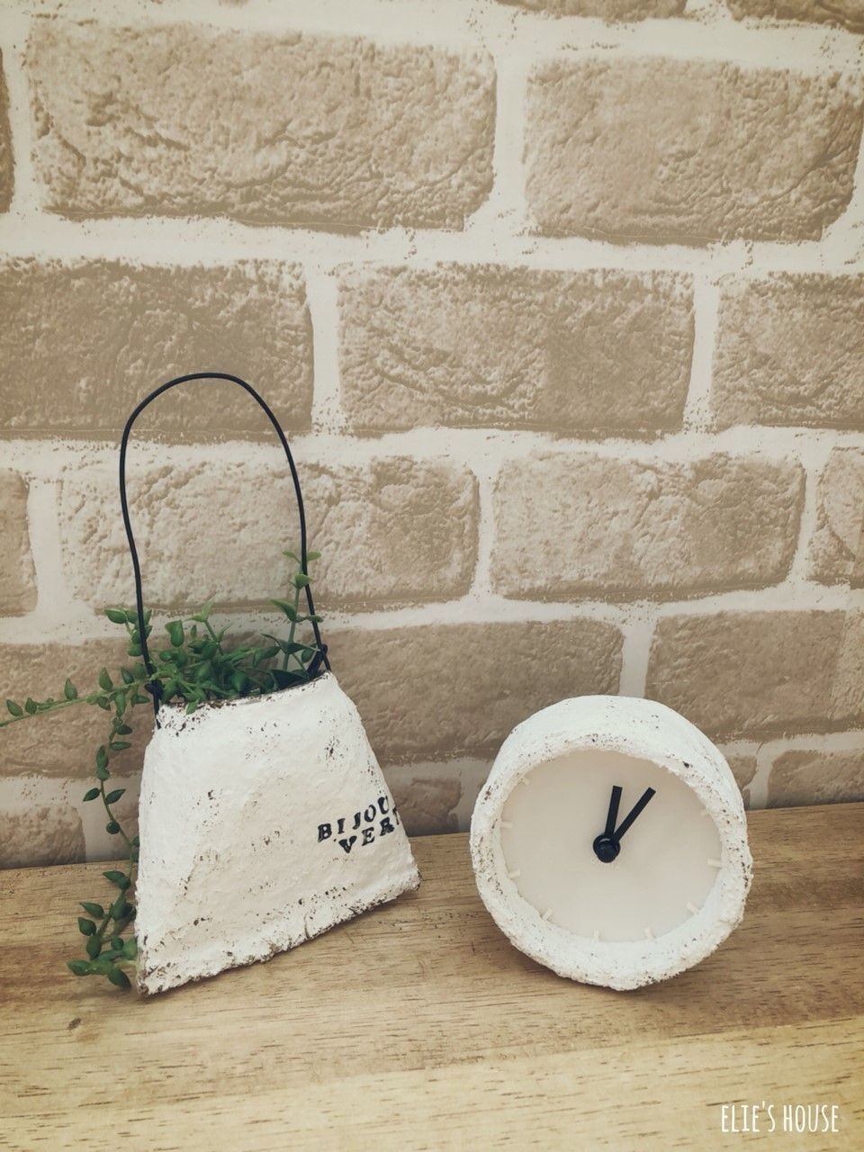 こちらのリメイクアイテムは、セリアの置時計プレーンに、同じくセリアの小分けパックの練り漆喰を塗ったもの。