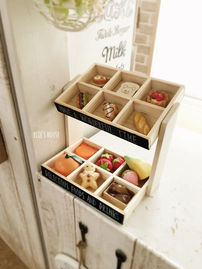 子どものままごとおもちゃやコレクションしている物を入れて飾っても可愛いです。今回のリメイクでは、仕切りボックスの側面を黒板塗料で塗ってさらにカフェっぽくしてみました。