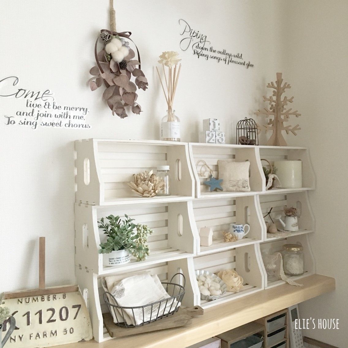 セリアの木製ラックを横にしてボンドを付けて重ねるだけで、簡単に雑貨屋さんのような飾り棚が作れます。3つ重ねて、2列以上にするのがポイントで、色を塗るとさらに素敵になります。お気に入りの雑貨を並べてSNS映えを狙ってみてはいかがでしょうか♪