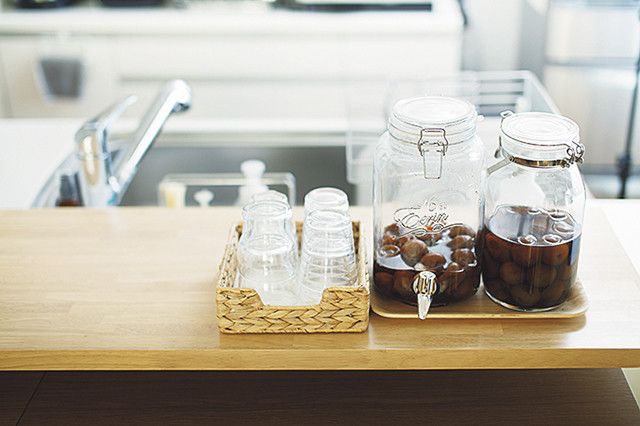 ごはん作り中など、忙しいときに家族がキッチンに入ってくると作業の邪魔になりイライラ! みんなが頻繁に使うグラスは、カウンターに常備しておけば、侵入頻度を減らせます。