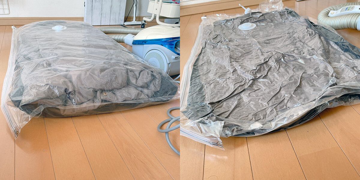 今も破れたりすることなく使い続けていますが、現在はリニューアルされて1枚で2枚を収納できる圧縮袋になっています。