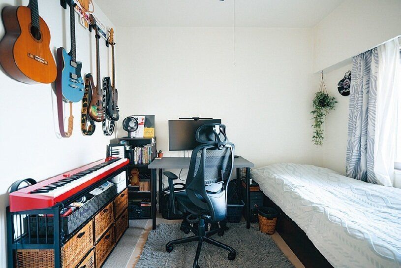 ギターを壁に飾って見せる収納。PCのモニターも壁掛けにしてデスクは「更地」に。仕事も趣味の作曲も快適に作業できるスペースを確保してるよ!