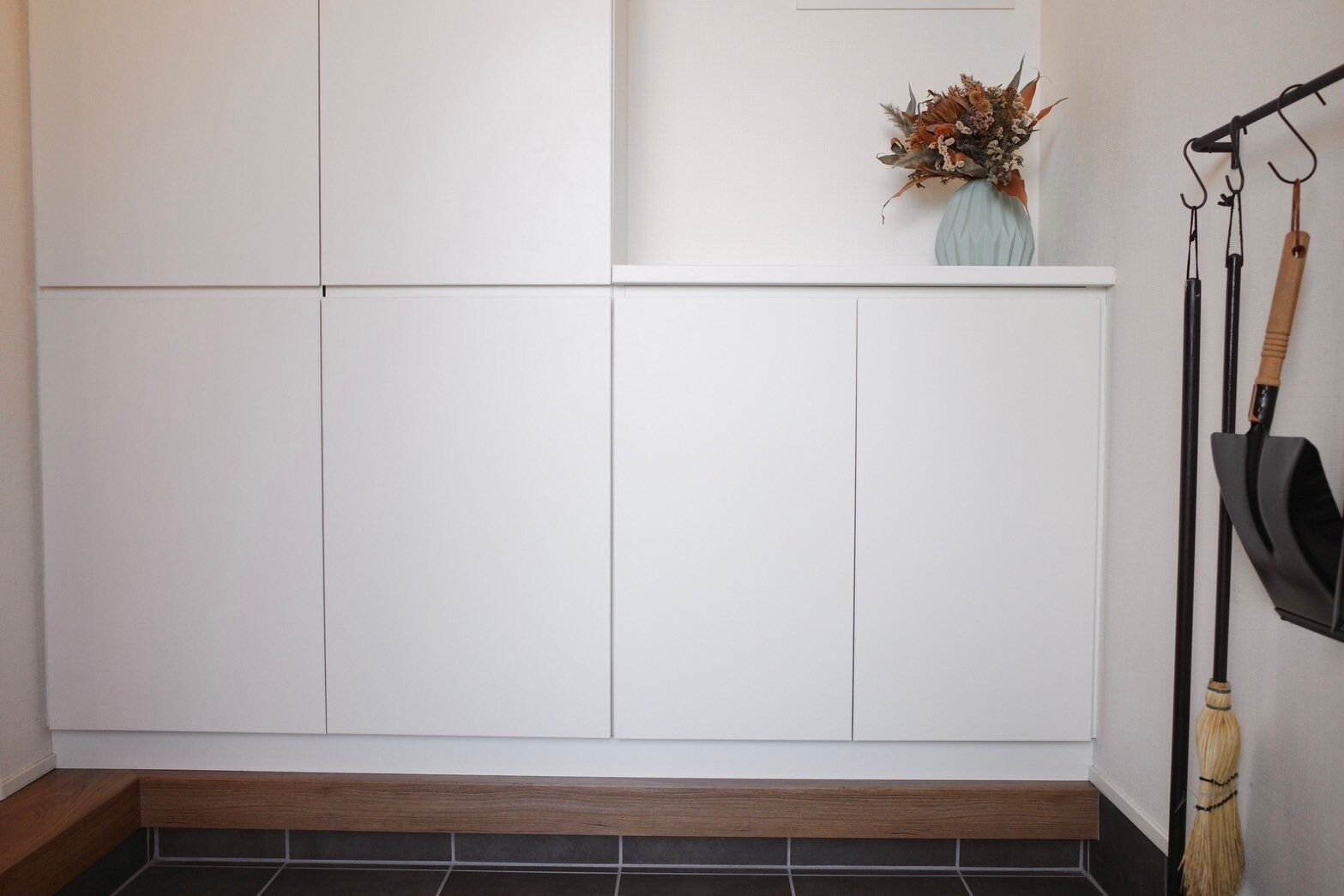 まずは、たたきや玄関ホールなどにモノをむき出し配置せず、靴箱内に収めるのが一番です。ご家族の靴の整理をすると、靴箱にもさらにスペースがうまれることもあるので、都度収納の見直しも必要になります。