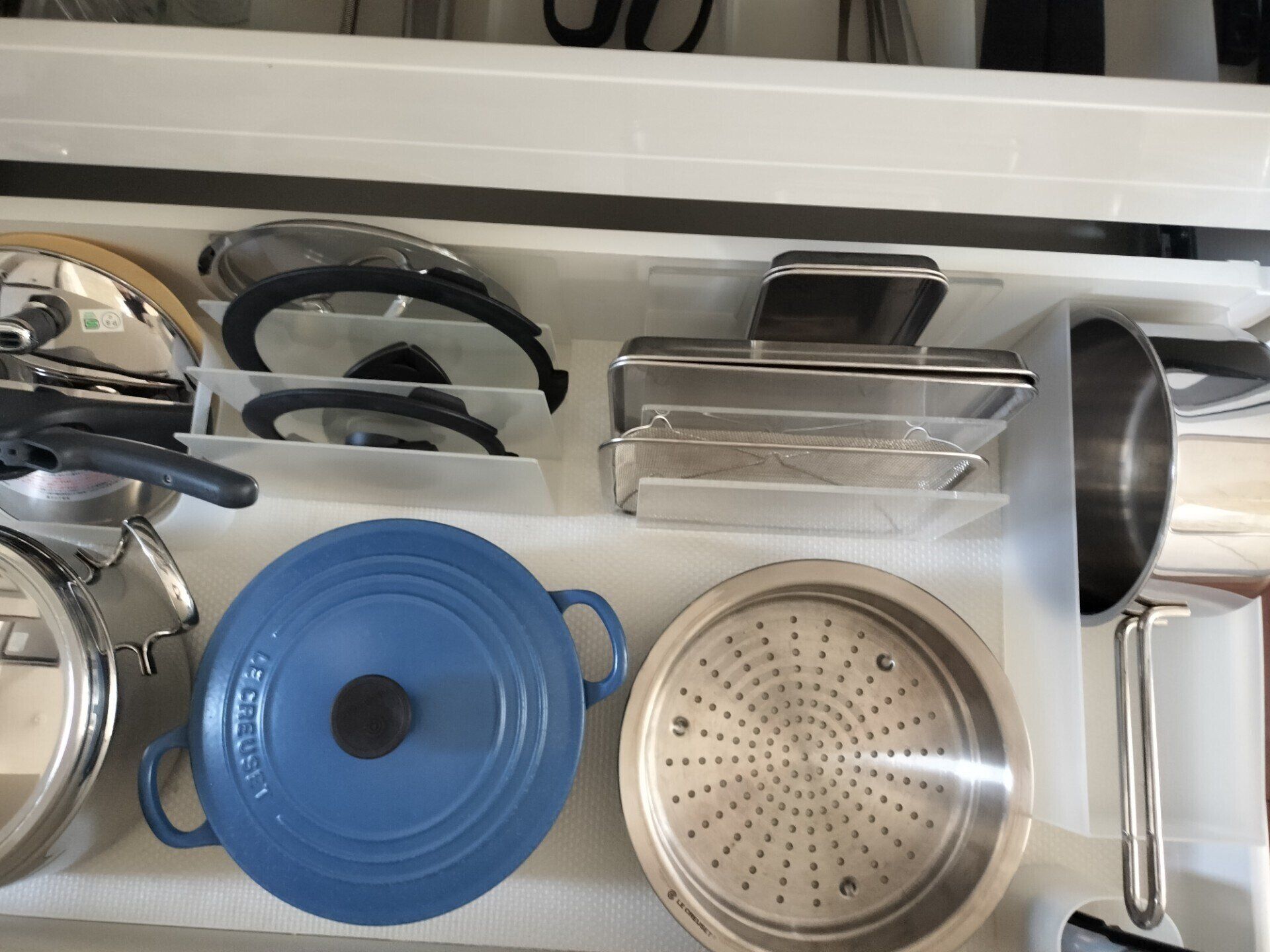 キッチンは料理をすることが目的なので、作業の流れを考えながら収納場所を決めることが大切です。また、キッチンの深い引き出しの中は「立てる」収納にすることで、見やすく取り出しやすい収納を省スペースでつくることができます。