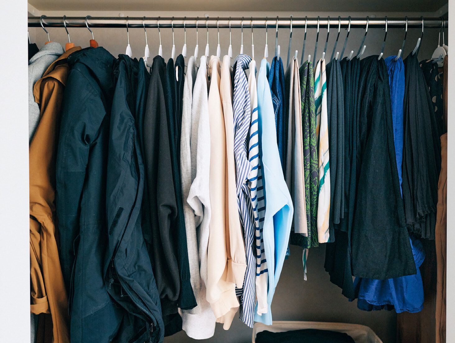 服をかき分けないと取り出せないクローゼットは、キャパオーバーと心得て。選びにくいし、しわもつきやすく残念。吊るされている状態で「これとこれ」と、上下セットをサッと取り出せる量に減らして。