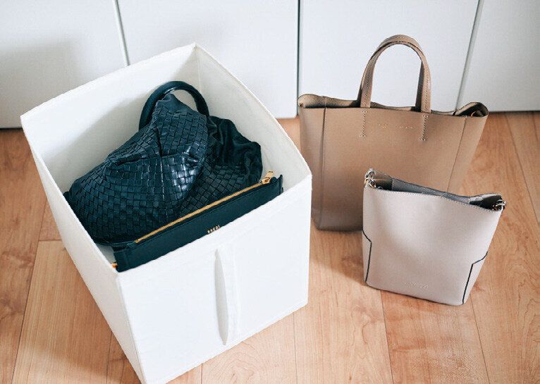 バッグはクローゼットの最上段を定位置に。自立する物は立てて置き、自立しない物は白いボックスにまとめるとスッキリします。長いショルダーひもはバッグの中に入れてしまうとごちゃつきません。