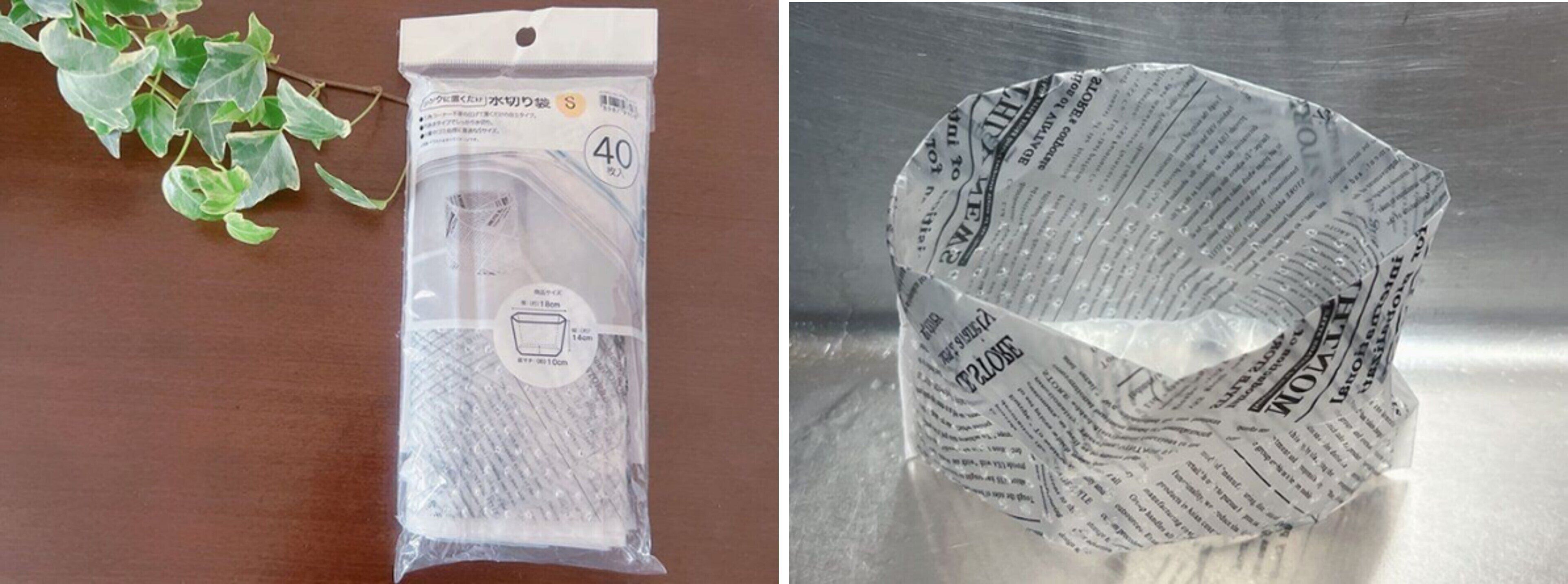 写真は我が家で使っているニトリの「水切り袋(S)」。199円で40枚入りなので、コスパも抜群ですよ。