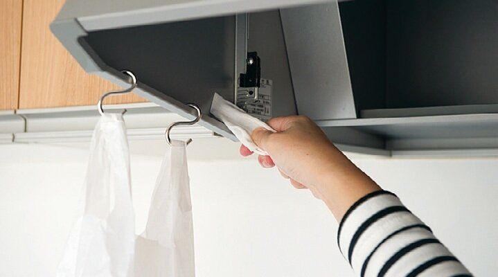 換気扇の内側は、へらか端が平らな割り箸をウエスでくるみ、汚れをこそげ落とす。S字フックにポリ袋を堤げ、汚れたウエスを捨てながら作業すると効率的。