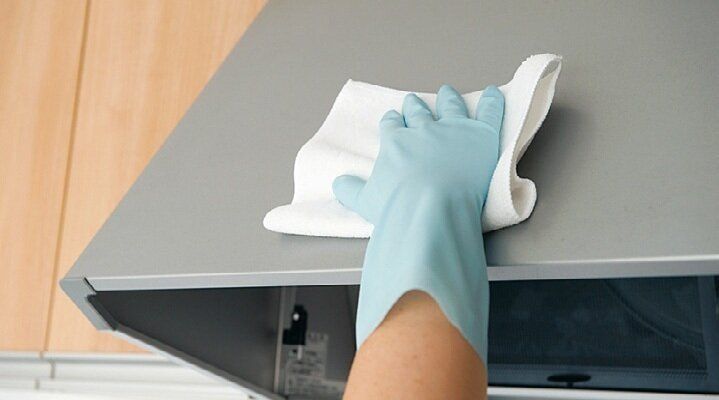 外側をマイクロファイバークロスでお湯拭きする。上部の天板部分など、汚れのひどい所は、アルカリ電解水をスプレーしたウエスで拭く。
