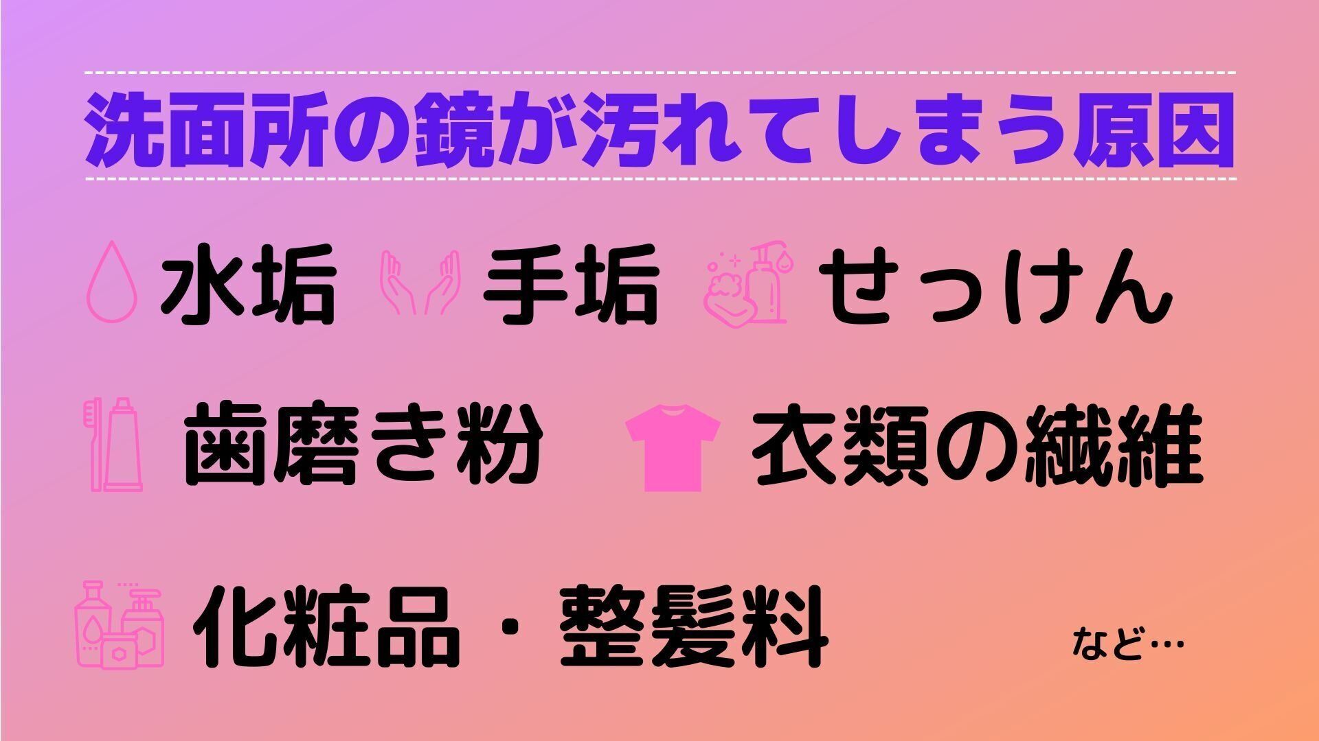 洗面所の鏡には、たくさんの汚れがついてしまいます。その汚れの種類も、ホコリ、水垢、歯磨き粉の飛び散りなど様々です。その汚れの原因を探らず、ただやみくもに掃除をしても、汚れが落ちないという可能性もあります。
